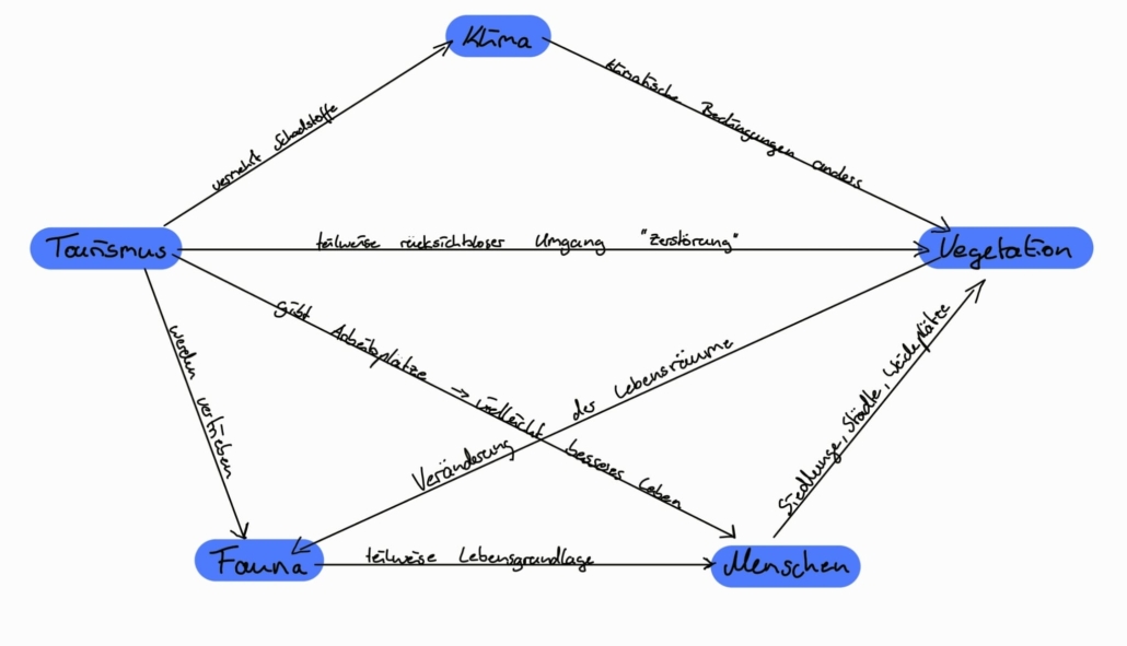 Die skandinavischen Länder leiden unter dem Klimawandel. Ursache ist, dass die meisten Touristen per Auto, Fähre oder Flugzeug dorthin reisen. Ein erhöhtes Verkehrsaufkommen entsteht und es wird mehr Kohlenstoffdioxid ausgesetzt. Eine Maßnahme wäre beispielsweise mit einem Kreuzfahrtschiff fahren, das mit Batterie- und LNG-Motoren betrieben wird. Außerdem werden mehr Extremwetter und Hitzewellen erwartet. Es kann passieren, dass die Temperaturschwankungen stärker werden, da Hochdruckwetterlagen länger anhalten. Die Folge sind Trockenperioden.